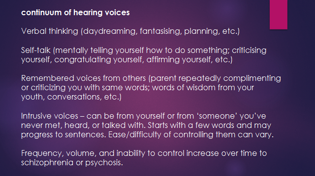 This continuum shows the progression of how anyone could develop auditory hallucinations, the psychological term also called hearing voices. Let’s start with basic verbal thinking – for example, daydreaming, fantasising, planning. We all do that, right? We all silently talk to ourselves, too. When criticising yourself, either silently or aloud, gets out of hand, it can be a sign of shaky mental health. As well, we all experience remembered voices. Again, if remembered voices criticising you keep repeating in your mind, this can be a sign of shaky mental health. All of us have also experienced intrusive voices that seem to come from nowhere, out of the blue. For me, they are often intuitive messages with advice on handling conflicts or for managing emotional distress. Some people have considered these intrusive voices as the voice of God or some other greater power. They often occur during or after prayer. If intrusive voices start to disturb you or advise you to harm yourself or others and you have trouble controlling them, you’re having auditory hallucinations. If the frequency, volume, and inability to control them increase over time, they can lead to psychosis. The intrusive voices make you out of touch with reality. I hope this has helped you understand and relate better to people with a diagnosis of mental illness.