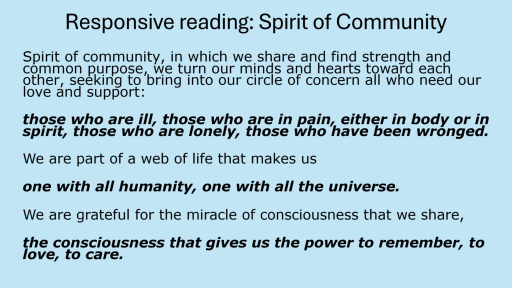 Before going on to cultural perspectives on mental health and illness, let’s do a Responsive Reading, Spirit of Community.